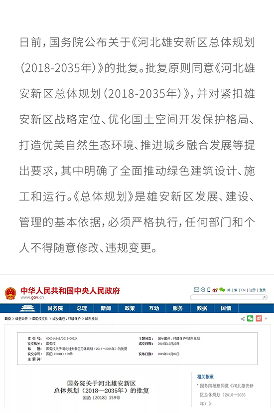國務院批復同意《河北雄安新區總體規劃(2018-2035年)》, 全面推動綠色建筑設計、施工和運行