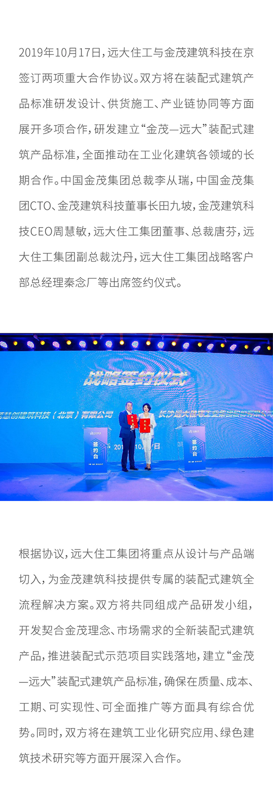 遠(yuǎn)大住工與金茂建筑科技簽訂兩項(xiàng)重大合作協(xié)議 研發(fā)建立“金茂—遠(yuǎn)大”裝配式建筑產(chǎn)品標(biāo)準(zhǔn) 全面展開產(chǎn)業(yè)合作